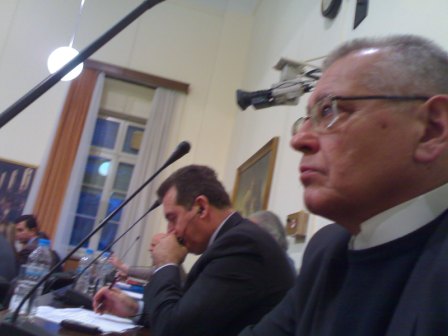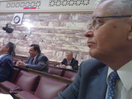 Ο ευρωβουλευτής, πρόεδρος του ΛΑΟΣ Γιώργος Καρατζαφέρης- διακρίνεται πίσω από τον Δημήτρη Κωνσταντάρα- ήταν παρών στη συνεδρίαση.
