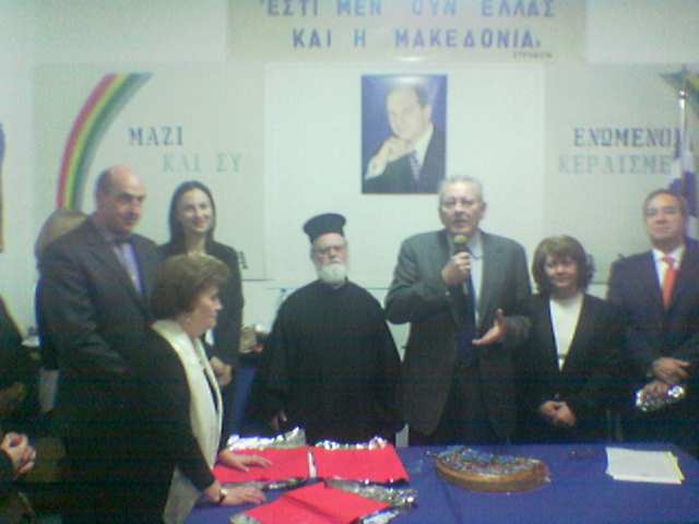 Στην κοπή της πίτας του Αγίου Δημητρίου Αμπελοκήπων. Διακρίνονται ο Υπουργός Πολιτισμού Γιώργος Βουλγαράκης, ο Υπουργός Οικονομίας Γιώργος Αλογοσκούφης και η βουλευτής Α Αθηνας Έλενα Κουντουρά. Δίπλα στον Δημήτρη Κωνσταντάρα η πρόεδρος της Τ.Ο Μαριάννα Κασαπλή.