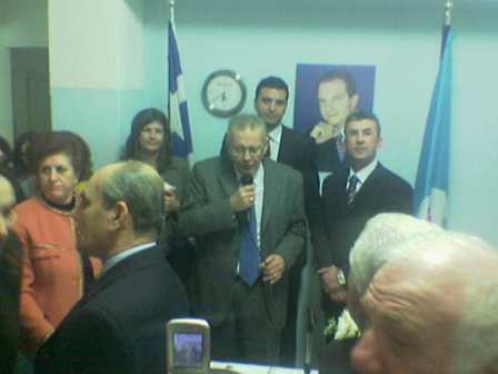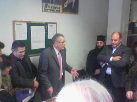 Πίσω απο το βουλευτή διακρίνεται ο Βασίλης Κικίλιας, αντιδήμαρχος ΟΝΑ και η Αλεξία Έβερτ αντίδήμαρχο κοινωνικής αλληλεγγύης.