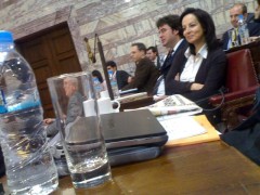 Τα στελέχη του ΠΑΣΟΚ Άννα Διαμαντοπούλου και Βασ. Οικονόμου κάθονται στα έδρανα που φιλοξενούν τις Μ.Κ.Ο.