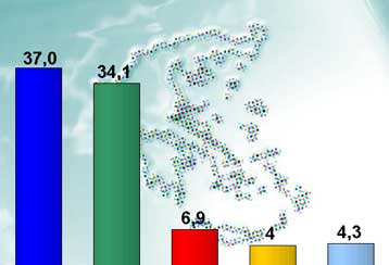 Αναλυτικά, βάσει των στοιχειών που παρουσιάστηκαν στην εκπομπή του MEGA «Ανατροπή», στην πρόθεση ψήφου η ΝΔ προηγείται με 37%, ακολουθεί το ΠΑΣΟΚ με 34,1%, το ΚΚΕ με 6,9%, ο ΣΥΝ με 4% και ο ΛΑΟΣ με 4,3%.