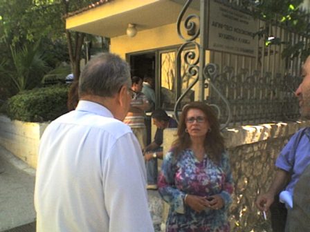 Ο Δημήτρης Κωνσταντάρας συνομιλώντας με την κα Σούλα Τριανταφύλλου της ΔΑΚΕ Αιγινητείου έξω από την πύλη του νοσοκομείου.