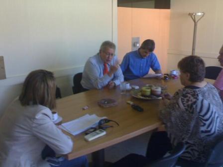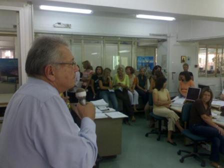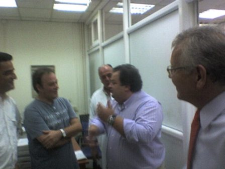 Ο Δημήτρης Κωνσταντάρας συζητά με τις κυρίες Αθηνά Τριανταφυλλίδου (αριστερά) και Ρουμπίνη Ρόκκου, πρόεδρο και γραμματέα αντίστοιχα του σωματείου εργαζομένων του ΚΕΗΥΚΥ . Δίπλα του ο συνεργάτης του κ. Γ. Πεχλιβανίδης.