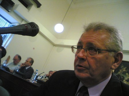 Σύντομη διαβούλευση με τον Σίμο Κεδίκογλου αφού έχω κατέβει από το βήμα της Βουλής. |