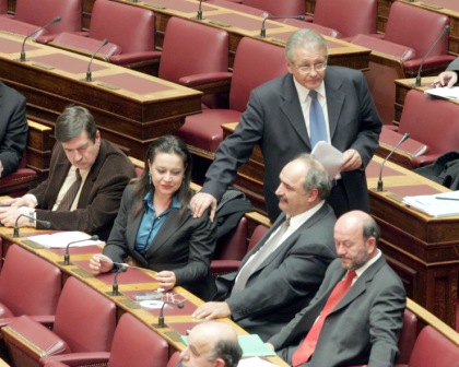 Μεγάλη συζήτηση δίπλα στον προεδρεύοντα της Βουλής κ. Χατζηγάκη την ώρα που αγορεύει ο Υπουργός Αγροτικής Οικονομίας κ. Μπασιάκος, Τελικά τα ρυθμίσαμε όλα.