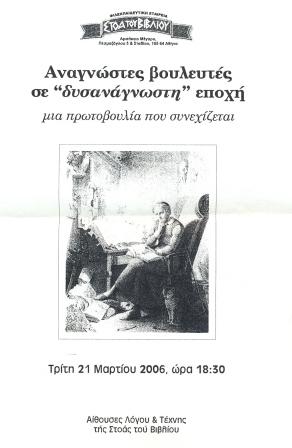 Τα βιβλία «Πολιτική Ανάπτυξη στην Ελλάδα» του Βύρωνα Πολύδωρα και «Ανταποκρίσεις από τη Λογοτεχνία» του Γιώργου Λιάνη επέλεξε να διαβάσει, να αξιολογήσει,να προκρίνει ως πιο ενδιαφέροντα και σημαντικά της χρονιάς 2005 ο βουλευτής Δημήτρης Κωνσταντάρας, στο πλαίσιο της έκθεσης «Αναγνώστες βουλευτές σε δυσανάγνωστη εποχή» που διοργάνωσε η Στοά του Βιβλίου με τη φροντίδα του καθηγητού Γιώργου Μπαμπινιώτη. Για τα δυο αυτά βιβλία μίλησε το βράδυ της Τρίτης, 21 Μαρτίου, στην εκδήλωση που έγινε στις Αίθουσες Λόγου και Τέχνης της Στοάς του βιβλίου ο Δημήτρης Κωνσταντάρας.