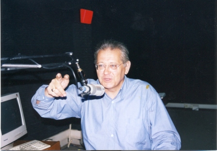 Με το μικρόφωνο της ΕΡΤ στα χέρια, σε εορταστική εκδήλωση στο Χίλτον, το 1979, παρουσία του Κωνσταντίνου Καραμανλή, ο οποίος του κάνει δήλωση. Από την άλλη πλευρά, με το μικρόφωνο της ΥΕΝΕΔ στο χέρι, η Νίνα Βλάχου. Στο βάθος φαίνεται μόλις ο Μιχάλης Λιάπης και δεξιά, η δημοσιογράφος Ελένη Μπίστικα.